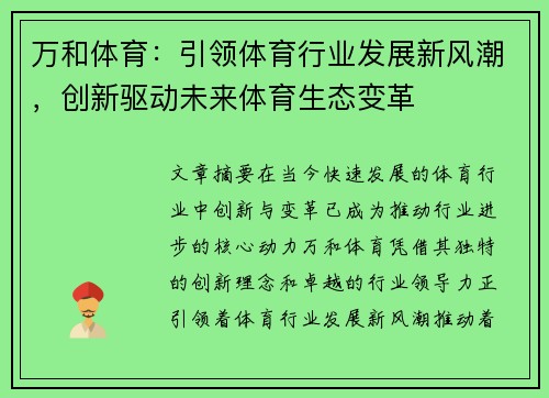 万和体育通过在智能化技术、产业融合、品牌建设和全球化战略等多个领域的持续创新,成功引领了体育行业的变革潮流。在未来的发展过程中,万和体育将继续通过技术驱动和战略布局,推动体育行业向更高效、更智能、更全球化的方向发展。